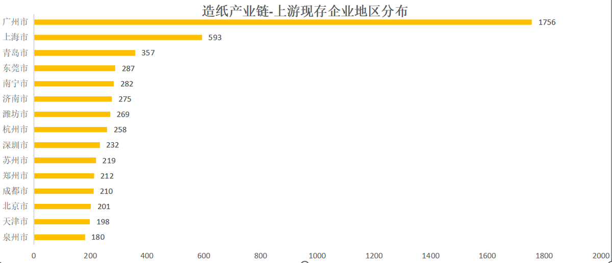 地域分布上,造纸产业链上游,分布在广州市的企业有1756家,明显超过第二名上海市593家,第三名青岛市357家。