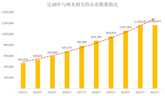 树木作为纸的基础原材料,还是构建现代基础生活的必要原材料,主要用途流向为造纸和纸制品业、家具制造业、木制工艺品、木材加工、地板制造和木、竹、藤、棕、草制品业。启信宝产业大数据显示,中国现存约116万家与树木相关企业,且近10年,相关企业数量稳步增加。
