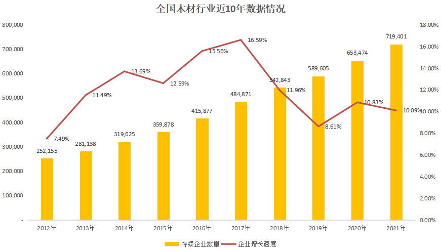 截至目前,我国与木材行业相关的企业有723166家。数据显示,木材企业从2018年开始增速放缓。这或与当年国务院颁布《中华人民共和国森林法实施条例》有关,《条例》要求在林区经营(含加工)木材,必须经县级以上人民政府林业主管部门批准。