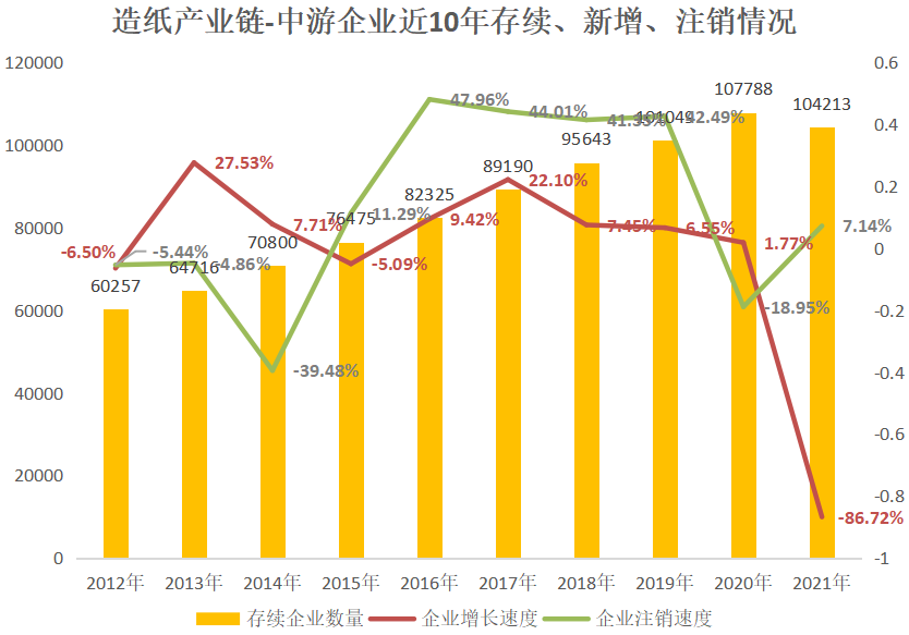 同时,启信宝产业大数据还显示,造纸产业链中游企业(主要涉及纸制品制造、造纸),2021年共存续企业104213家,相比2020年减少3575家,并且企业增长率(新增速度)从2020年的1.77%首次跌入负增长-86.72%。造纸产业链上、中游企业的减少,导致造纸行业产能波动,或为纸价上涨的另一个原因。