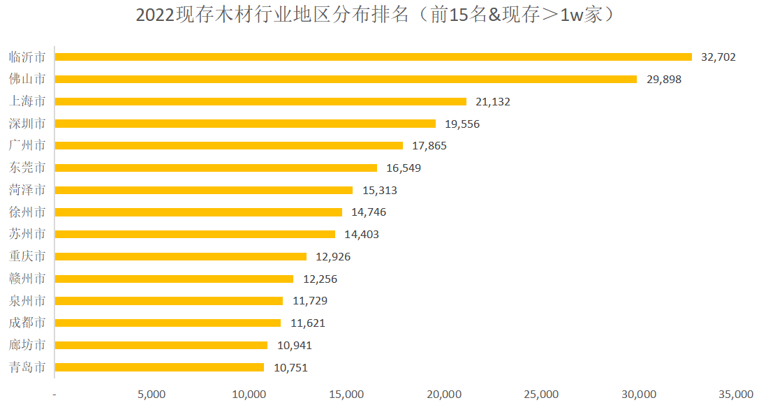 区域分布上,临汾市、佛山市、上海市成为现存木材行业地区分布排名前三名。