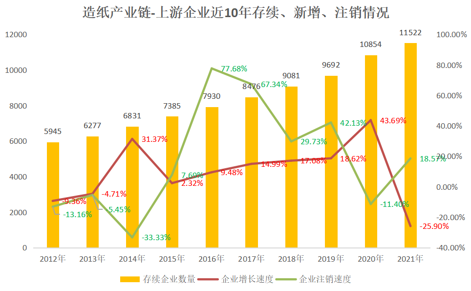 造纸产业链主要分为上游(纸浆制造等)、中游(纸制品制造、造纸等)、下游(包装等)。上游企业经营范围主要涉及制浆造纸、纸浆、浆纸、木浆、浆板、湿浆,启信宝产业大数据显示,2021年,造纸产业链上游存续企业11522家,企业增长率(新增速度)首次从2020年的43.69%降为-25.90%,上游企业的减少,或对造纸原材料的涨价产生了影响。
