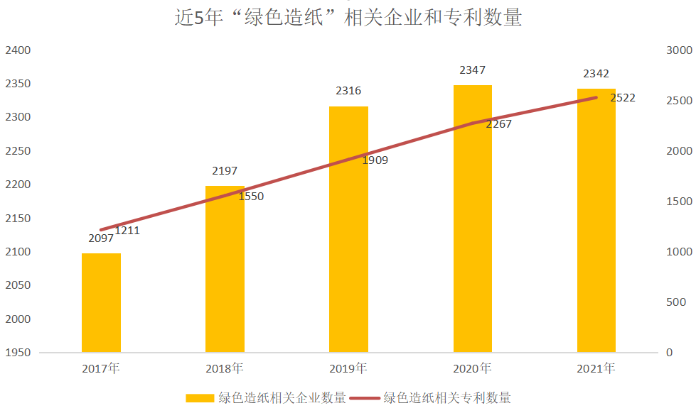 启信宝产业大数据显示,“绿色造纸”相关企业和专利数量,近5年都在逐年递增。2021年共有2342家相关绿色造纸企业,2522件相关专利。