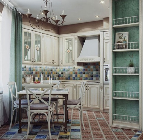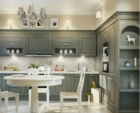 白色与灰绿的完美结合,让厨房充满着温暖,偶尔点缀的马赛克,也给单调的橱柜增加了不少活跃成分,小小的餐桌让厨房生活顿显生气。