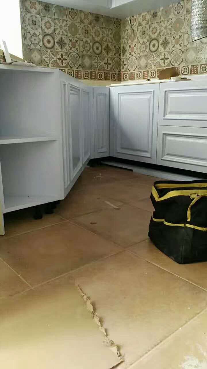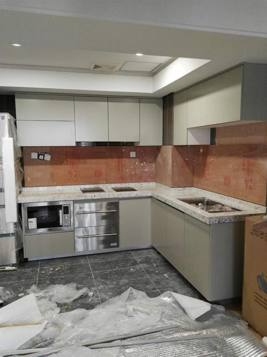 还记得上一次我们发过的广州金沙洲黄先生的橱柜吗?那时候的橱柜还没有安装台面的,如图今天我们安装师傅继续跟进安装,把台面装