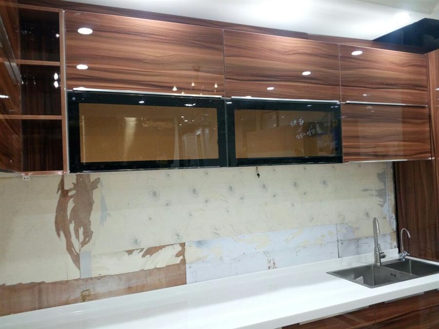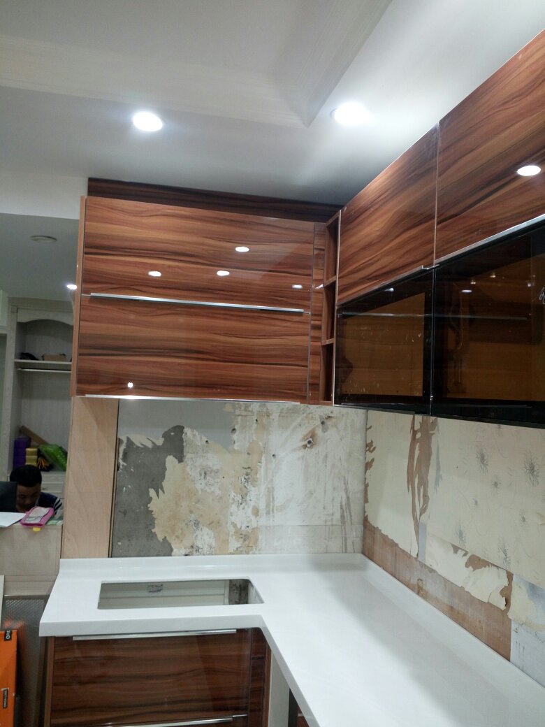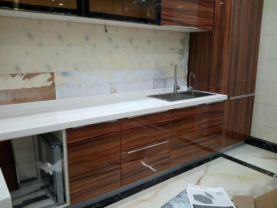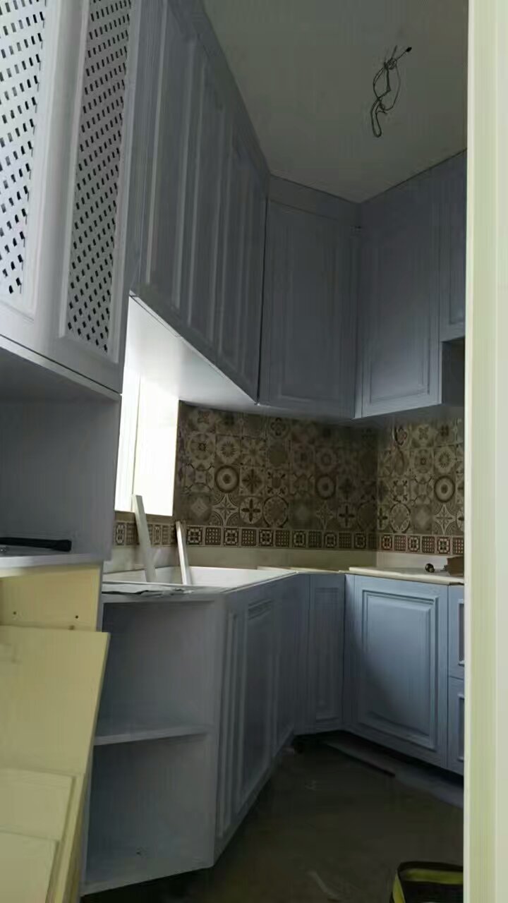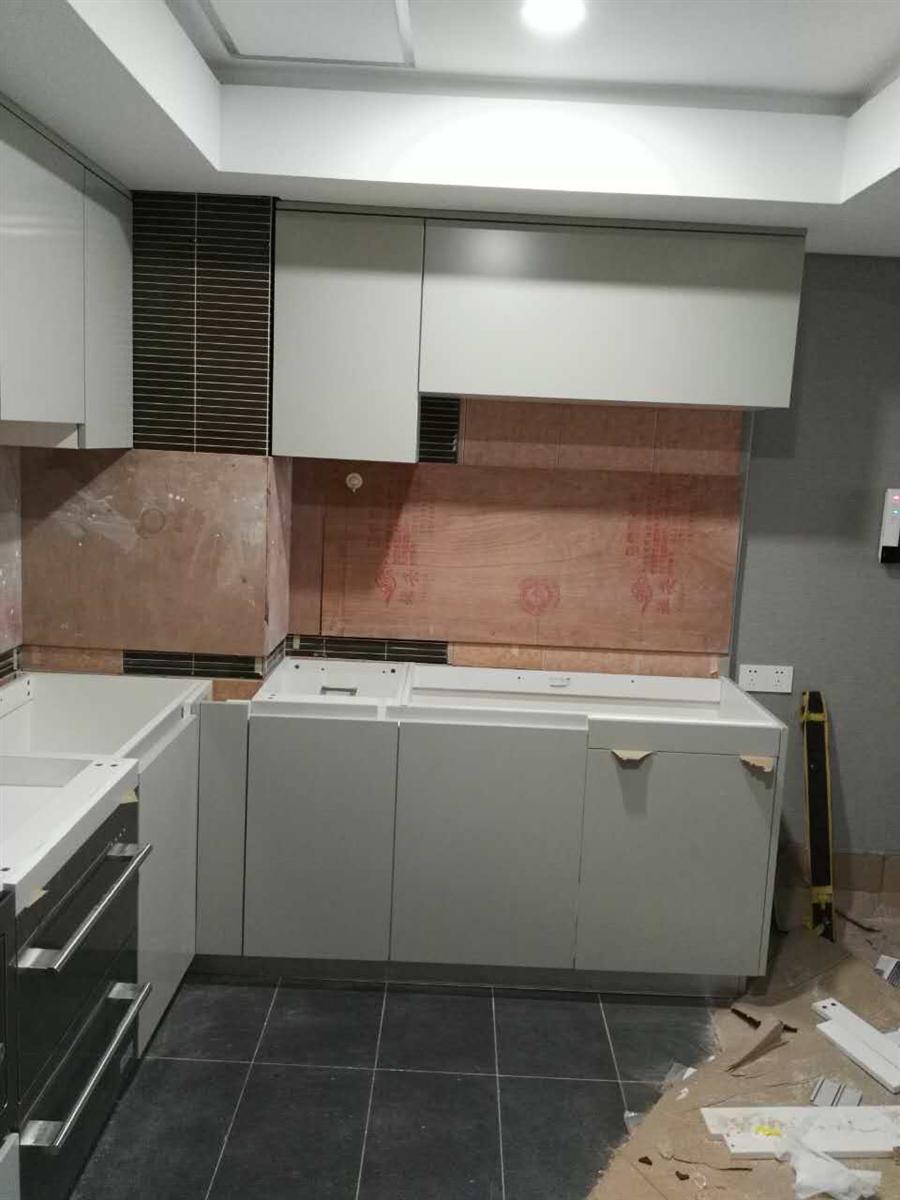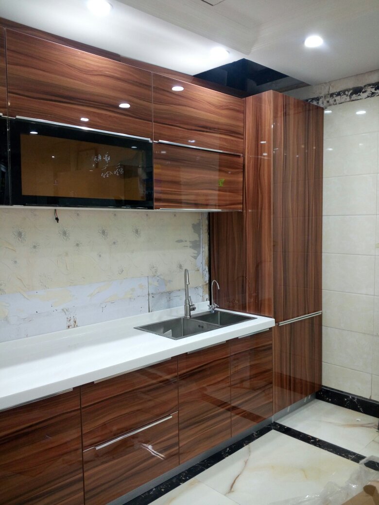 下面是广州花都李先生的UV高光橱柜现场安装图今天一早,我跟设计师去请教了,这一款橱柜表面处理是UV高光木纹的,基材是吉盛唐朝